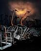 Massimiliano Corteselli Tout est brûlé, c’est le point de non-retour, le feu se nourrit de tout ce qu’il trouve sur son passage : des maisons en équilibre dans un paysage irréel, des manèges sans plus de fonction, une chapelle qui reste debout comme un totem intouchable.