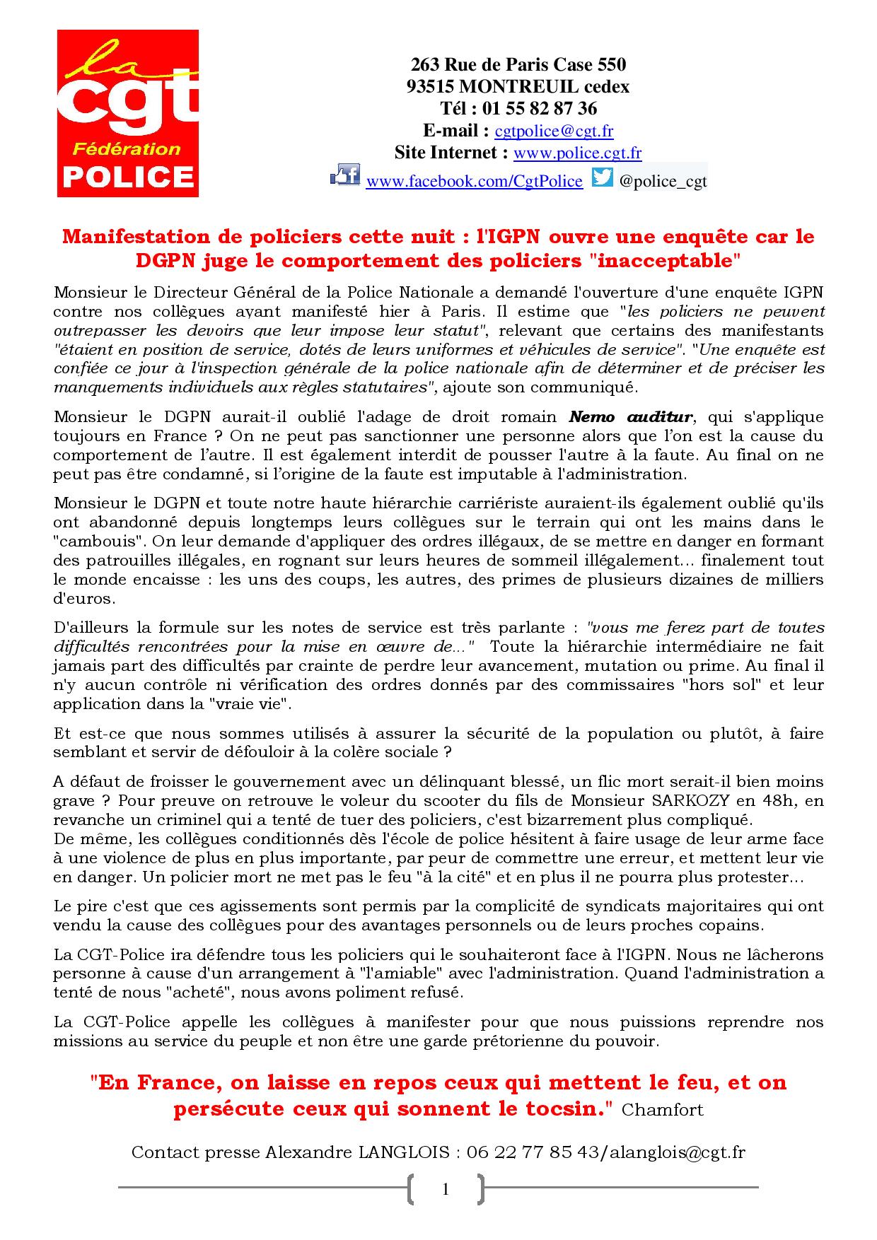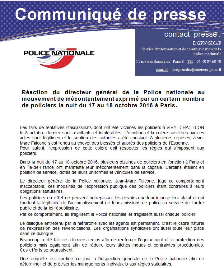 Jugeant que les policiers-manifestants «fragilisent la police nationale et fragilisent aussi chaque policier», Falcone annonce qu'une enquête a été confiée à l'Inspection générale de la police nationale (IGPN), provoquant un nouveau coup de sang dans les rangs. La CGT Police l'a interpellé dans un communiqué : «Monsieur le DGPN et toute notre haute hiérarchie carriériste auraient-ils également oubié qu'ils ont abandonné depuis longtemps leurs collègues sur le terrain qui ont les mains dans le "cambouis" ?»